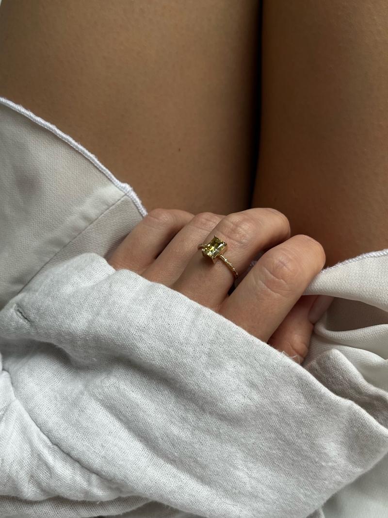 Кольцо с жёлтым муассанитом радиант мелкими муассанитами по шинке