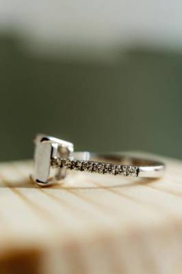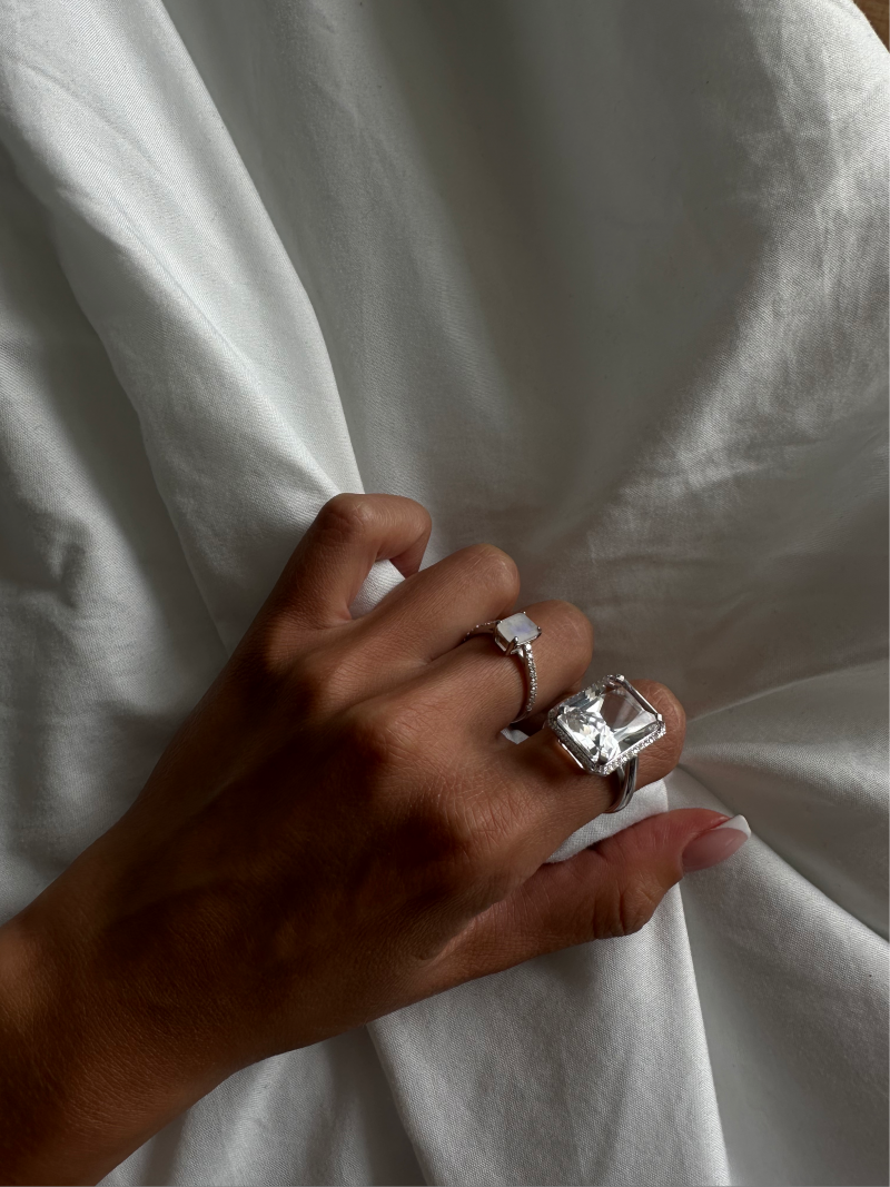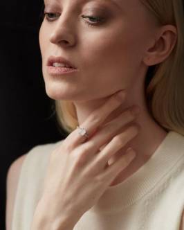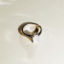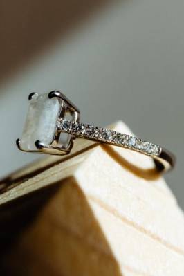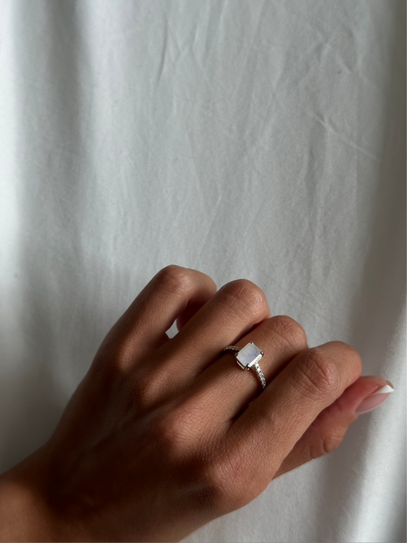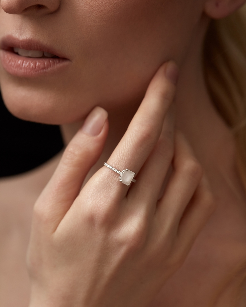 Кольцо с лунным камнем и бриллиантами Камень: лунный камень 8/6 мм Бриллианты: по 1,5 мм (3/5 цвет/чистота) на половину шинки На фото модель в белом золоте