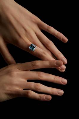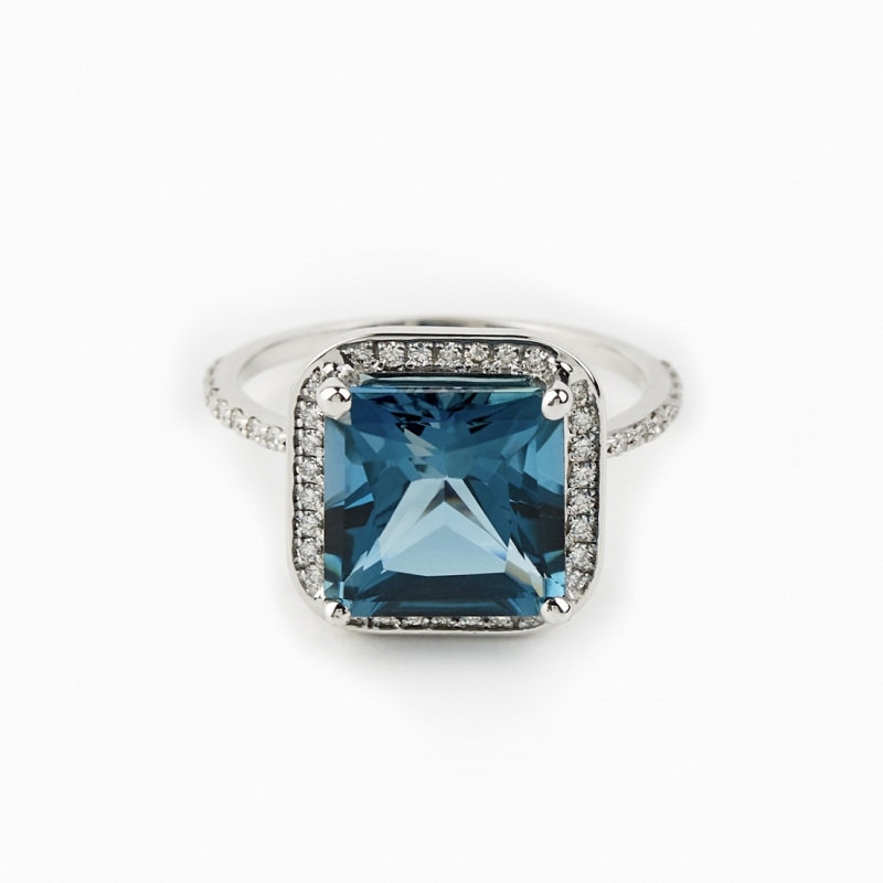 Кольцо с Лондон топазом и бриллиантами Камень: натуральный топаз огранки принцесса 10/10 мм Бриллианты: 35 штук по 1 мм (3/5 цвет/чистота) На фото модель в белом золоте