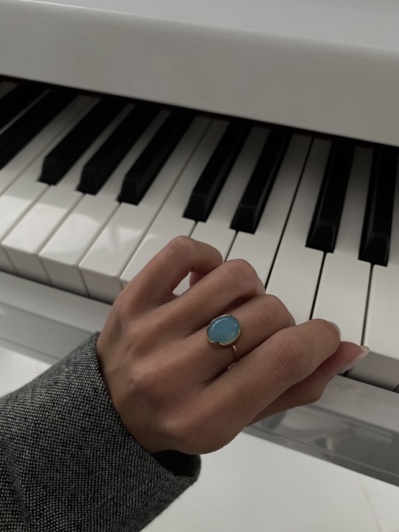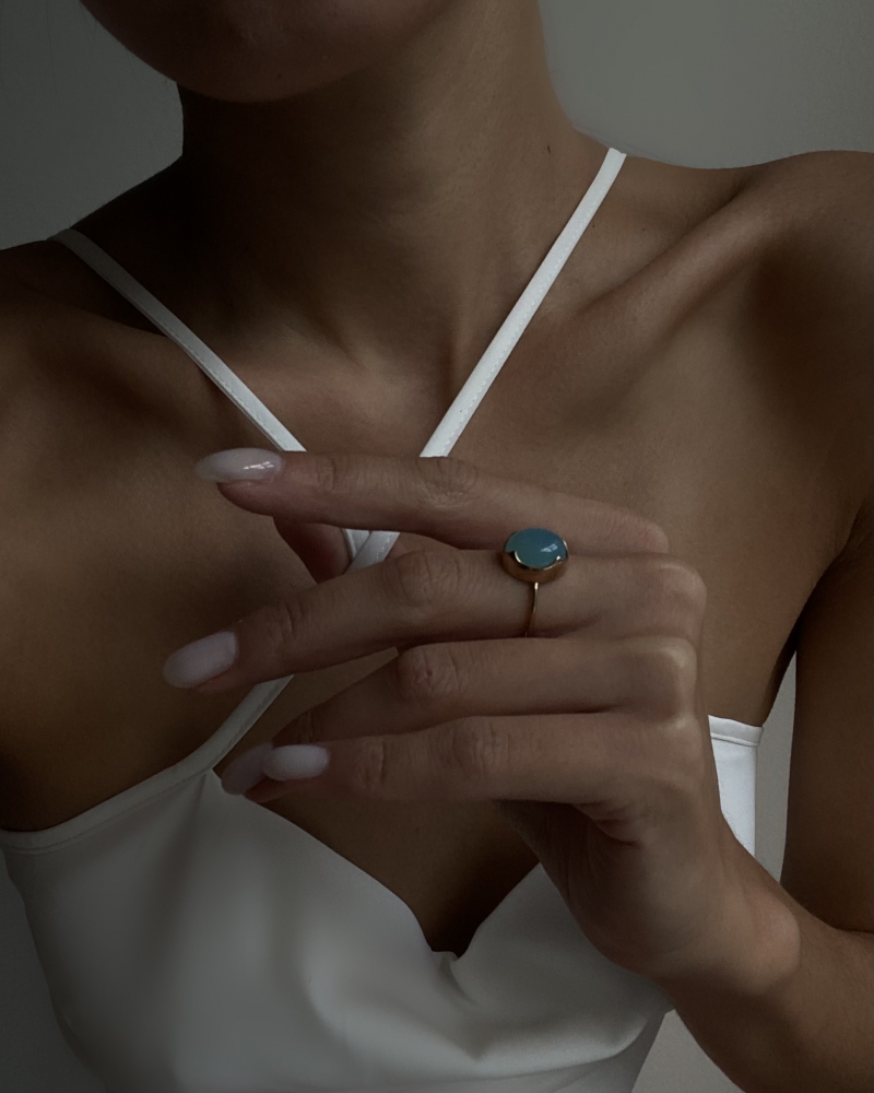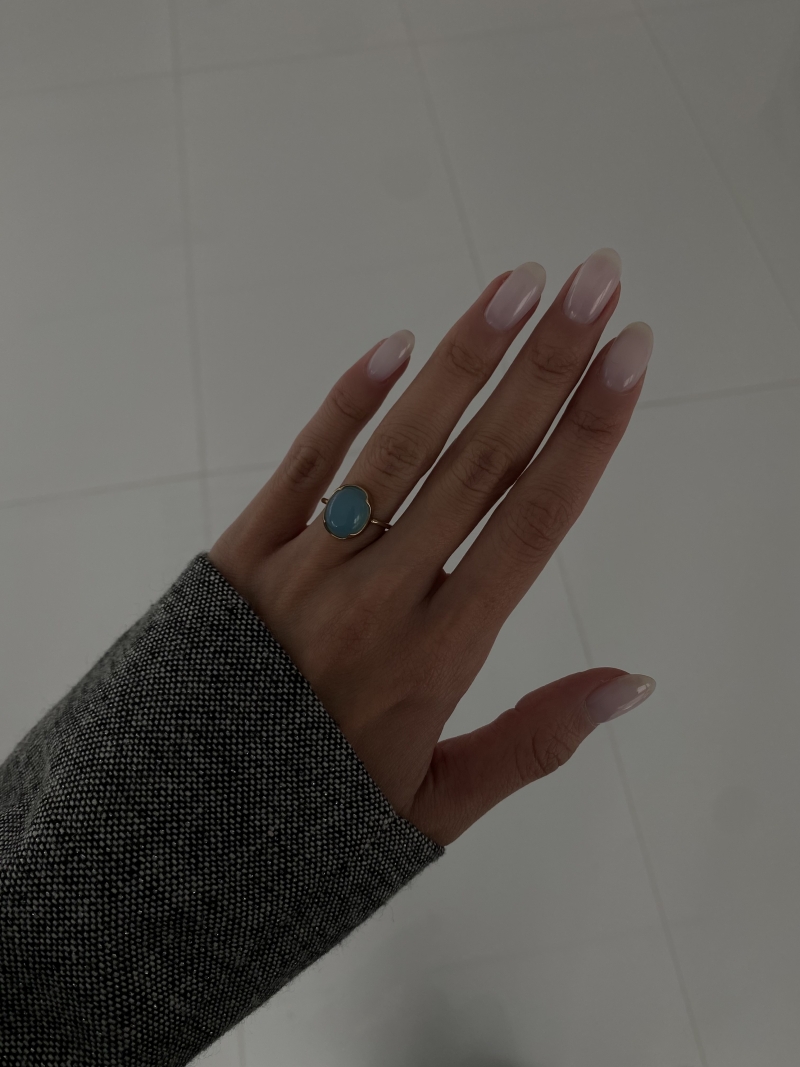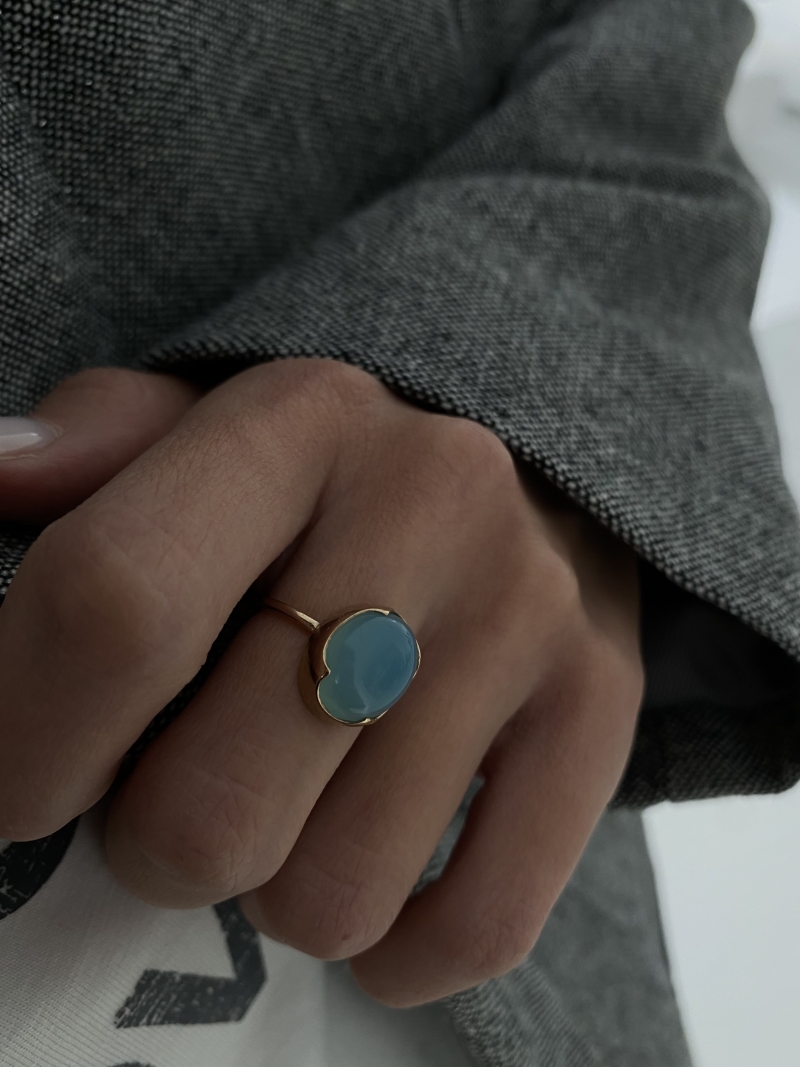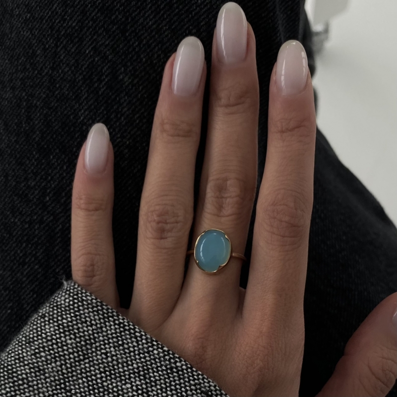 Кольцо "Тюльпан" с синим халцедоном Вставка: натуральный синий халцедон овальной формы Размер камня: 7/10мм Закрепка камня: Тюльпан Металл: на выбор