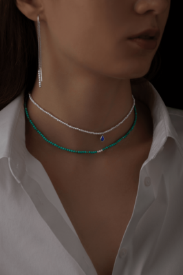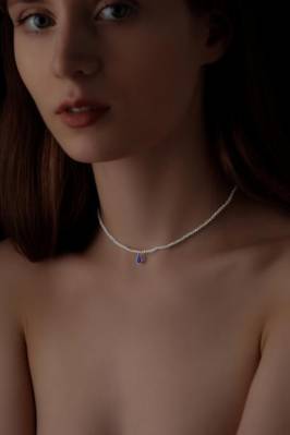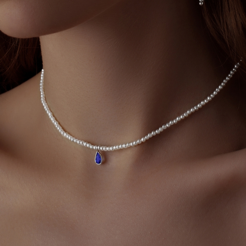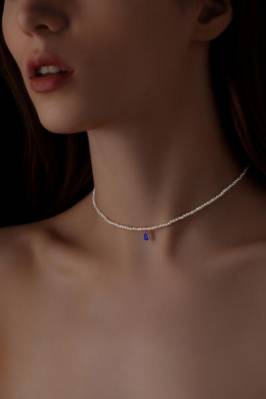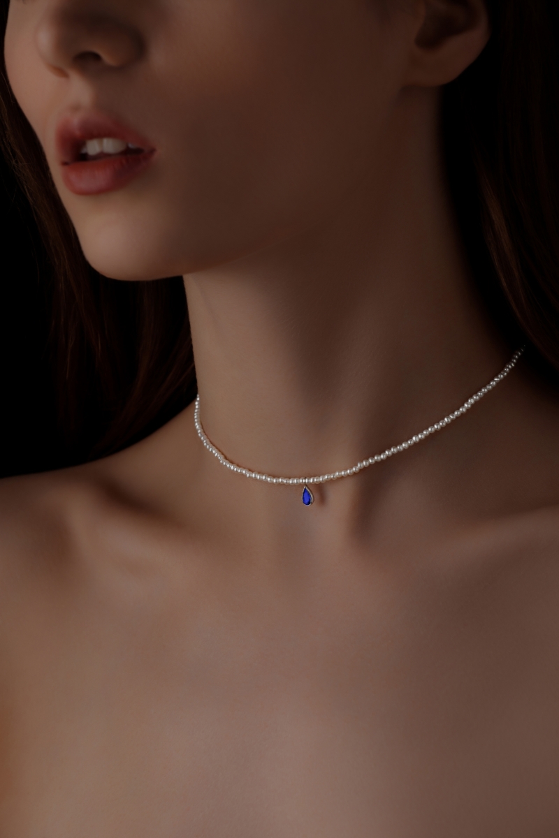 Жемчужный чокер с сапфиром Белый натуральный жемчуг: 2.5-3мм Сапфир формы капля: 3/5мм Металл: на выбор