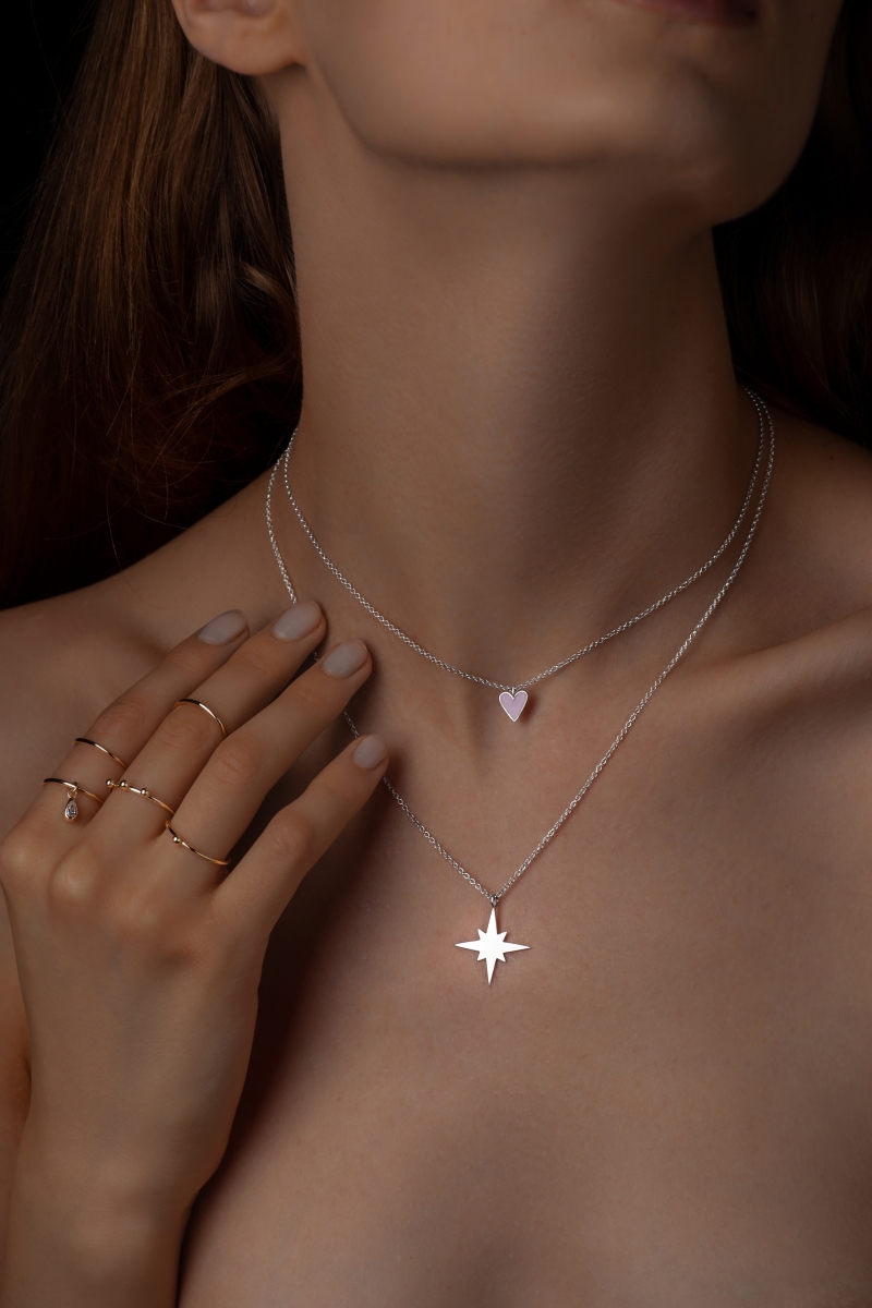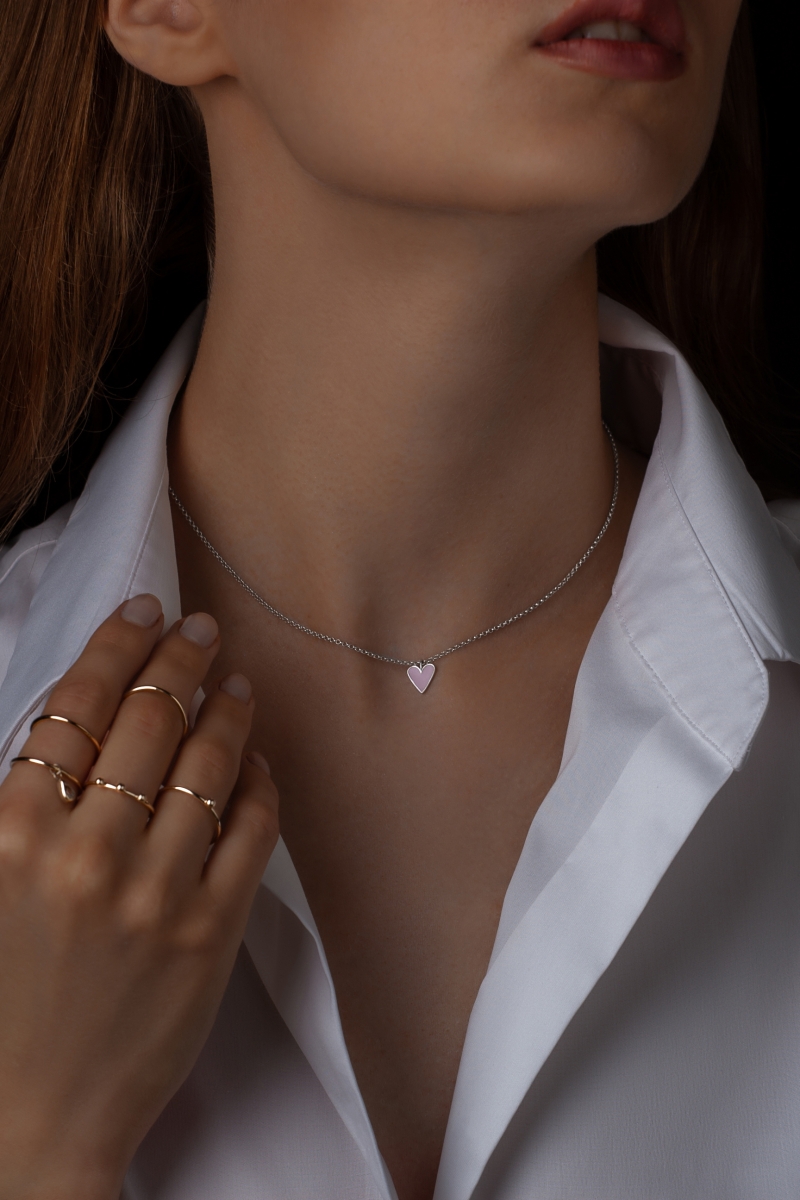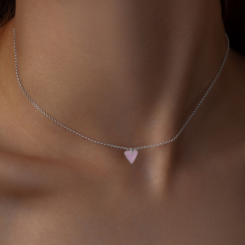 Подвеска с розовым сердцем, эмаль Размер символа: 8 мм (с ушком: 10 мм) Эмаль: розовая Длина цепочки: 37/40 см Металл: на выбор
