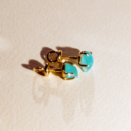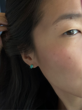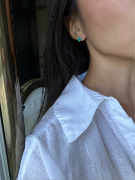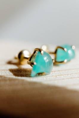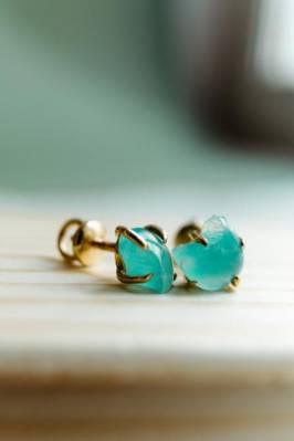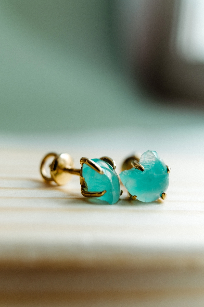 Серьги пусеты с изумрудным кварцем Вставка: неограненный апатит в оттенке "параиба" На фото: модель в желтом золоте