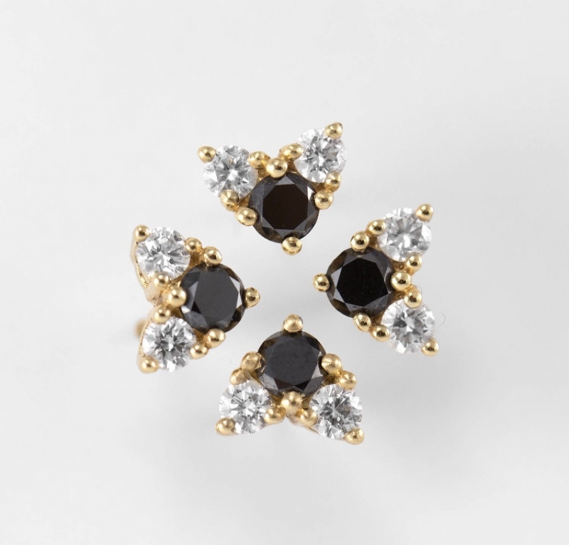 Пуссеты «Клевер» с бриллиантами Вставка: черный бриллиант 2,5 мм 2 шт Белые бриллианты 4 шт по 1,5 мм (3/5 цвет/чистота) Замок: винтовой На фото: модель в желтом золоте